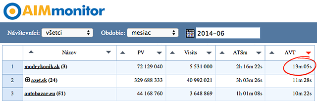 Modrý koník je číslo 1 medzi všetkými monitorovanými webmi v čase strávenom na stránke na jednu návštevu (Average Visit Time). To znamená, že ak niekto ide na modrykonik.sk v priemere tam strávi 13 minúť, kým odíde na inú stránku.